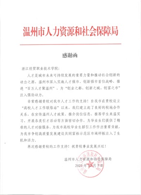 温州市人力资源和社会保障局向我校发来感谢函