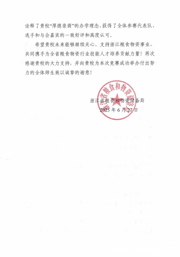 近日,学校收到浙江省粮食与物资储备局发来的感谢信,感谢学校在第七届浙江省粮食行业职业技能竞赛工作的支持。2025年6月24日至26日,由浙江省粮食与物资储备局和省人力社保厅、省总工会共同主办的第七届浙江省粮食行业职业技能竞赛在我校圆满落幕。本次竞赛是历届省赛中赛事规格最高、赛场纪律最严、竞技水平最高的一次全省性粮食行业职业技能竞赛。